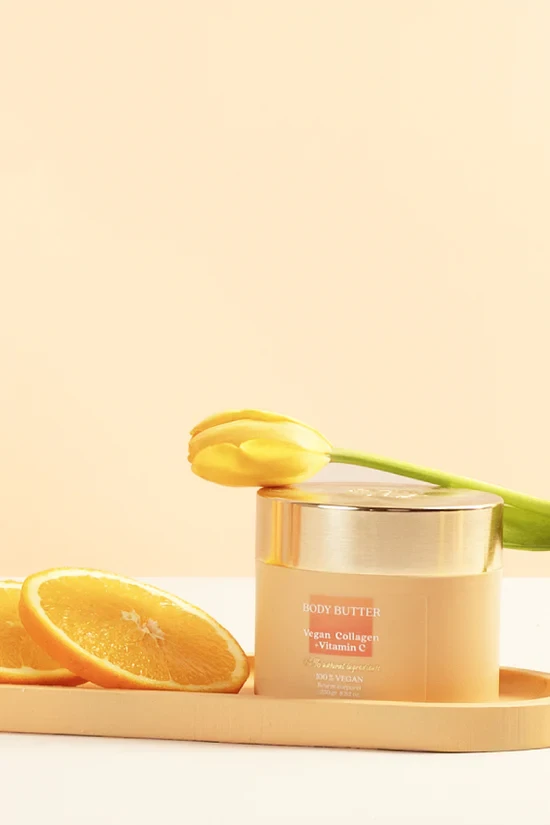 Skin Type SuitabilityThis body butter is suitable for all skin types, including dry, normal, and sensitive skin. Indulge your skin with a luxurious body butter enriched with Vegan Collagen and Vitamin C. This rich, nourishing formula deeply hydrates while promoting firmness and radiance, leaving your skin soft, supple, and glowing. With 94% natural ingredients, it provides a clean, vegan-friendly skincare experience designed to restore vitality and smoothness. Key Benefits