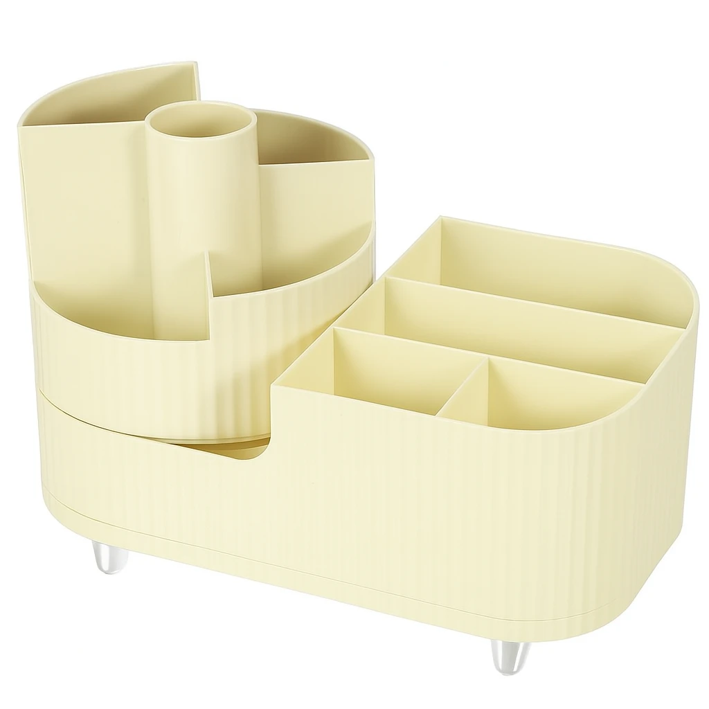 Simplify your space with this Compact Multi-Compartment Cosmetic Organizer. Designed with modern minimalism in mind, this organizer features a clever layout to help you neatly store makeup brushes, pens, skincare items, or office accessories — all in one place. Product Features:Multiple compartments for categorizing items: tall slot for brushes, divided sections for small items Made from durable, high-quality plastic with a soft matte texture Modern ribbed design with rounded corners for an elegant aesthetic Lightweight and portable, ideal for small spaces Raised on small stable feet for extra hygiene and style Suitable for cosmetics, stationery, jewelry, or remote controls How to Use:Place taller items like brushes or pens in the central slot Use divided sections for lipsticks, accessories, paperclips, or skincare bottles Set it on any flat surface like a vanity, shelf, or work desk Wipe clean with a damp cloth to maintain its neat appearance Great For:Makeup lovers Students and creatives Office or work-from-home setups Minimalist home decor lovers |