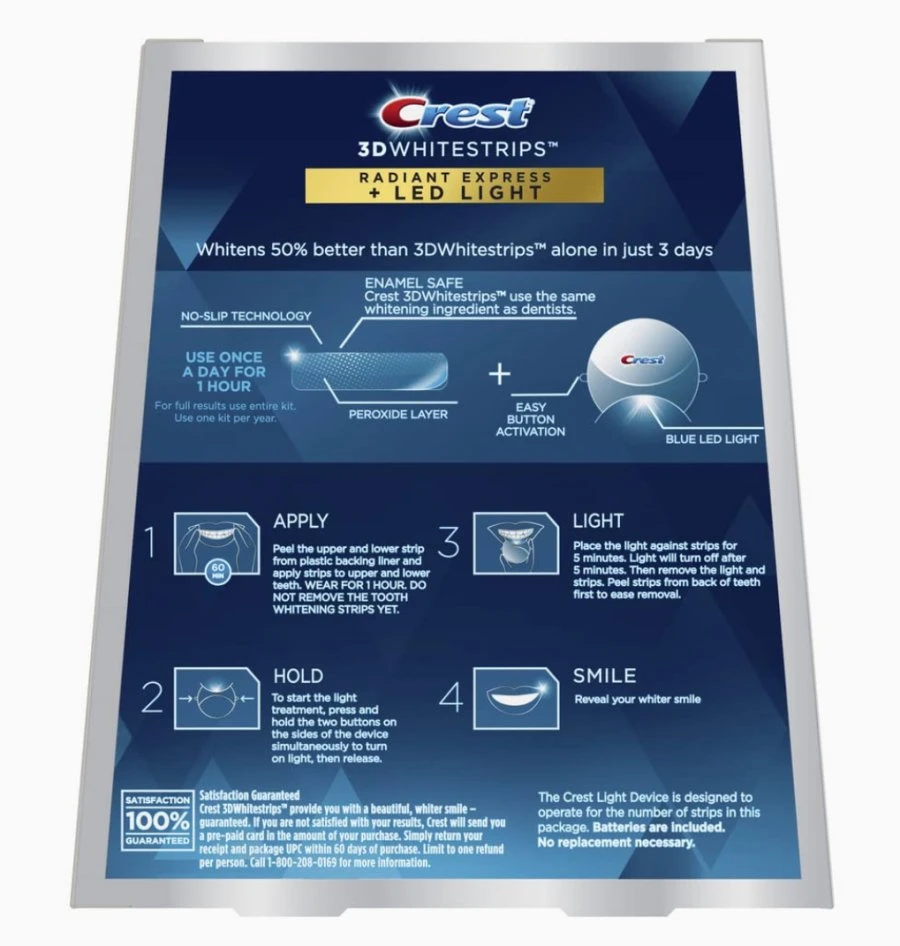 Unlock your most radiant smile with the Crest 3D Whitestrips Radiant Express + LED Light kit — the most advanced at-home whitening system from America’s #1 dentist-recommended whitening brand. Designed to deliver 34 levels of whitening, this powerful duo combines professional-grade whitening strips with an LED light for maximum brightness and long-lasting results in just days. Key Benefits: