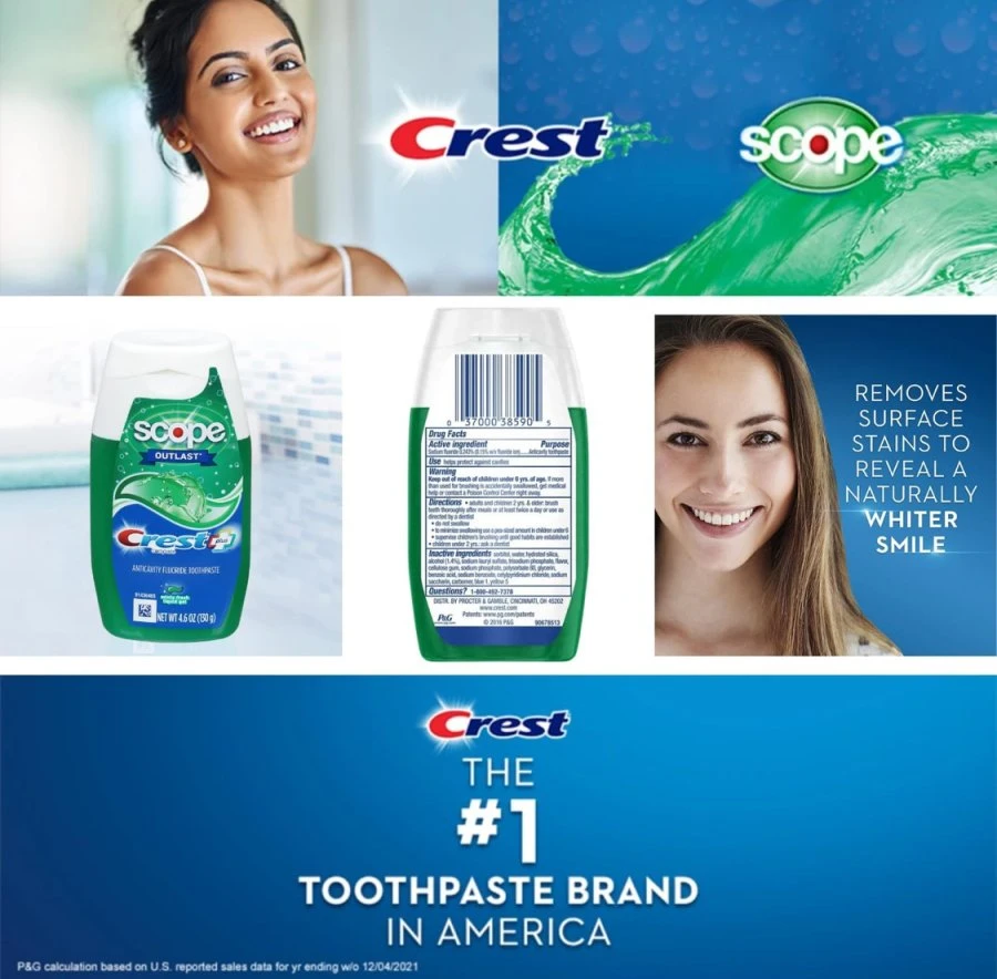 Marketing Description: Experience long-lasting freshness and complete oral care with Crest Complete + Scope Outlast Toothpaste. This advanced formula combines the cleaning power of Crest with the long-lasting breath-freshening benefits of Scope Outlast. It fights cavities, whitens teeth, and delivers a cool minty flavor that keeps your breath feeling fresh for hours. Key Benefits: