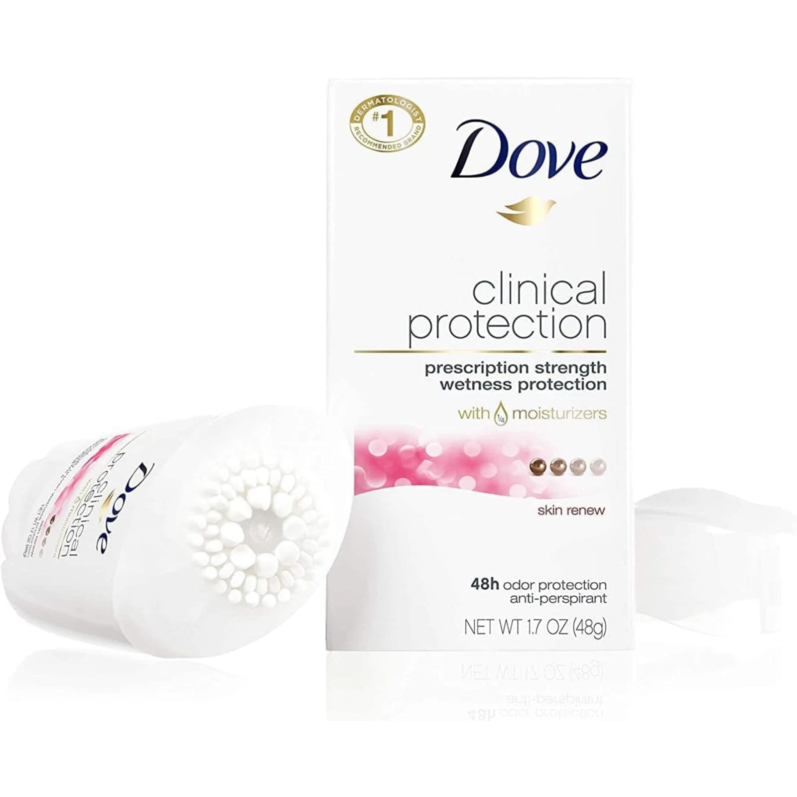 Experience prescription-strength wetness protection with the care of Dove. Clinical Protection Skin Renew combines powerful odor and sweat defense with moisturizing ingredients that help keep underarm skin soft, smooth, and renewed. Enjoy long-lasting freshness and confidence all day. Benefits 48-hour odor and sweat protection. Prescription strength wetness control for heavy perspiration. Contains ¼ moisturizers to reduce irritation caused by shaving. Skin renewal support – helps improve skin tone and texture underarms. Gentle on skin while delivering powerful antiperspirant performance. Suitable For All skin types, including sensitive skin. Dermatologist-tested, gentle formula with moisturizers. Suitable Area of Use Specifically formulated for underarms. How to Use Apply to clean, dry underarms. For best results, apply at night before bed; the formula works overnight to form a protective layer for the next day. Can also be applied in the morning if preferred. Warnings & Precautions For external use only. Do not apply to broken or irritated skin. Discontinue use if rash or irritation occurs. Keep out of reach of children. If swallowed, seek medical help right away |