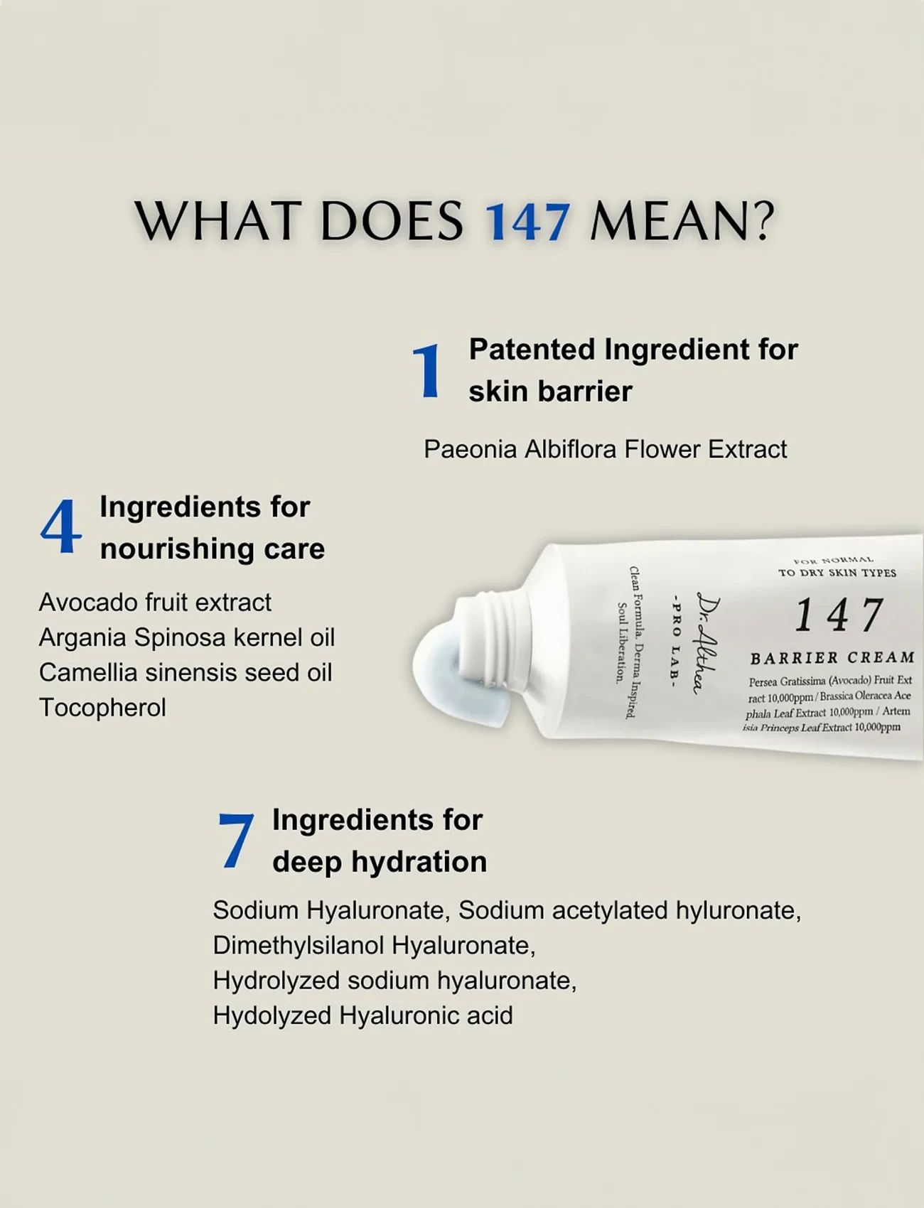 Suitable for any skin type Yes – suitable for all skin types, especially normal to dry skin. Dr. Althea 147 Barrier Cream is a dermatologist-inspired, clean-formula moisturizer designed to strengthen the skin barrier and deliver long-lasting hydration. Enriched with avocado fruit extract, centella asiatica leaf extract, ceramides, and hyaluronic acid, it provides intensive nourishment while locking in moisture. The lightweight yet rich texture absorbs easily, leaving skin smooth, supple, and protected against environmental stress. Benefits