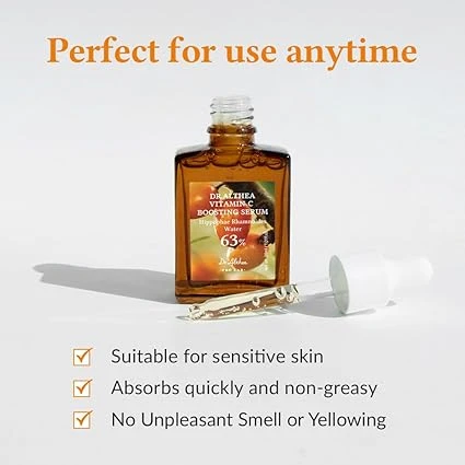 Suitable for all skin typesThis serum is suitable for all skin types, including sensitive skin, thanks to its gentle formulation with 63% Hippophae Rhamnoides (Sea Buckthorn) Water which provides natural Vitamin C and antioxidants. Marketing DescriptionBrighten and energize your skin with the Dr. Althea Vitamin C Boosting Serum! Infused with a high concentration of 63% Sea Buckthorn Water, this serum delivers powerful antioxidants and natural Vitamin C to revitalize dull skin, improve elasticity, and restore radiance. Its lightweight, non-irritating formula makes it ideal for daily use, even on sensitive skin, leaving your complexion luminous, healthy, and refreshed. Benefits