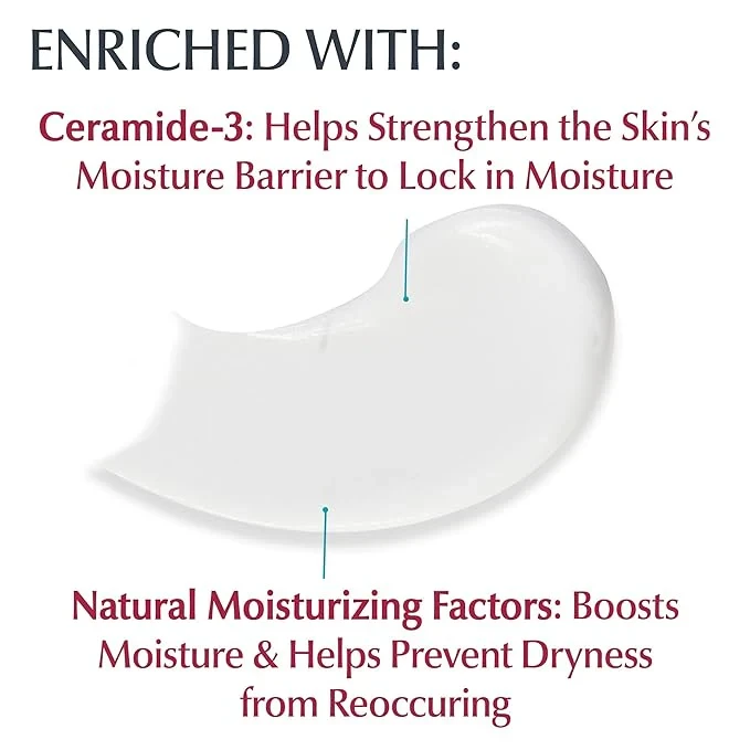 Suitable for: Eucerin Advanced Repair Cream is suitable for all skin types, including very dry and sensitive skin. It is dermatologist-recommended and non-comedogenic, making it ideal for individuals seeking to improve skin hydration and texture. The fragrance-free formula ensures minimal risk of irritation, even for those with sensitive skin. Eucerin Advanced Repair Cream is a rich, non-greasy moisturizer designed to provide immediate and long-lasting hydration for very dry skin. Enriched with Ceramide-3 and Natural Moisturizing Factors, it helps strengthen the skin's moisture barrier and replenish moisture to prevent dryness from recurring. The cream absorbs quickly without leaving a sticky residue, making it suitable for daily use. Benefits: Deep Hydration: Provides 48-hour moisture, leaving skin feeling soft and smooth. Strengthens Skin Barrier: Contains Ceramide-3 to help restore and maintain the skin's natural protective barrier. Gentle Formula: Fragrance-free, dye-free, and paraben-free, reducing the risk of irritation. Non-Comedogenic: Won't clog pores, making it suitable for use on the face and body. Fast Absorbing: Absorbs quickly without leaving a greasy residue. Suitable Areas: This cream is designed for use on the body. It is gentle enough for use on the face, but it's recommended to perform a patch test first, especially for those with sensitive facial skin. Avoid applying near the eyes or on broken skin. How to Use: Apply generously to clean, dry skin. Massage gently until fully absorbed. Use daily, preferably after showering, to lock in moisture. For best results, pair with Eucerin Advanced Repair Cleanser. Usage Warnings: For external use only. Avoid contact with eyes; in case of eye contact, rinse thoroughly with water. Keep out of reach of children. Discontinue use if irritation occurs and consult a healthcare professional. Sunburn Alert: This product contains Alpha Hydroxy Acid (AHA), which may increase your skin's sensitivity to the sun and the possibility of sunburn. Use a sunscreen, wear protective clothing, and limit sun exposure while using this product and for a week afterward. |