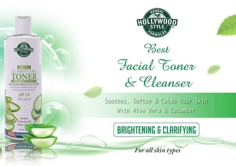 Hollywood Style Facial Clarifying Toner is a refreshing and purifying toner formulated with natural Aloe Vera and Cucumber extracts. Designed to remove leftover impurities, tighten pores, and balance the skin’s pH, this toner helps maintain clear, smooth, and healthy-looking skin. Its gentle, alcohol-free formula soothes and hydrates, making it ideal for daily use to revive tired, oily, or blemish-prone skin. KEY BENEFITS: