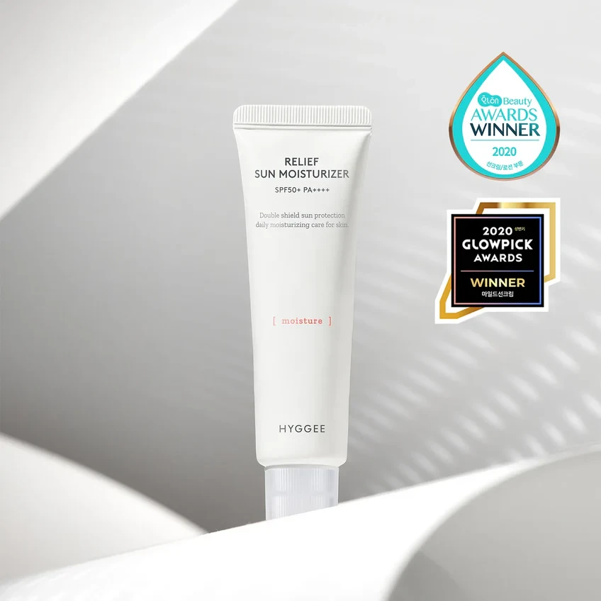 This sun moisturizer is suitable for all skin types, especially dry and sensitive skin. Its formula combines sun protection with moisturizing care for daily use. Experience double benefits with Hyggee Relief Sun Moisturizer SPF50+ PA++++. This innovative sunscreen not only provides broad-spectrum UVA & UVB protection but also deeply moisturizes the skin for a healthy, glowing complexion. With a soft lotion texture, it absorbs quickly, leaving the skin fresh, hydrated, and perfectly shielded from harmful sun rays. Benefits