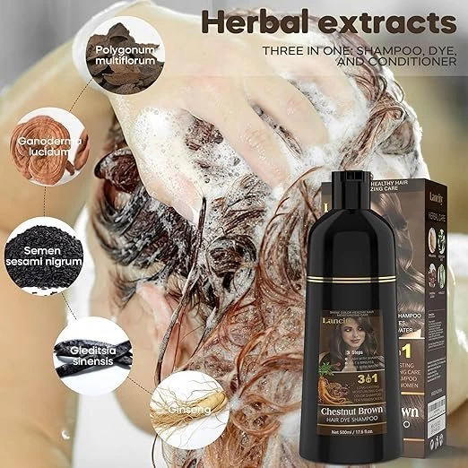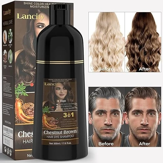 Color, cleanse, and nourish your hair in one simple step with Lancity Hair Dye Shampoo 3-in-1 – Chestnut Brown. Designed with a natural herbal formula, this innovative shampoo instantly delivers even, vibrant color while gently cleansing the scalp and conditioning the hair. Enriched with plant-based ingredients, it ensures deep hydration and long-lasting results—all without the use of ammonia or harsh chemicals. Perfect for those looking to cover gray hair or refresh their natural tone, quickly and safely at home. Key Benefits