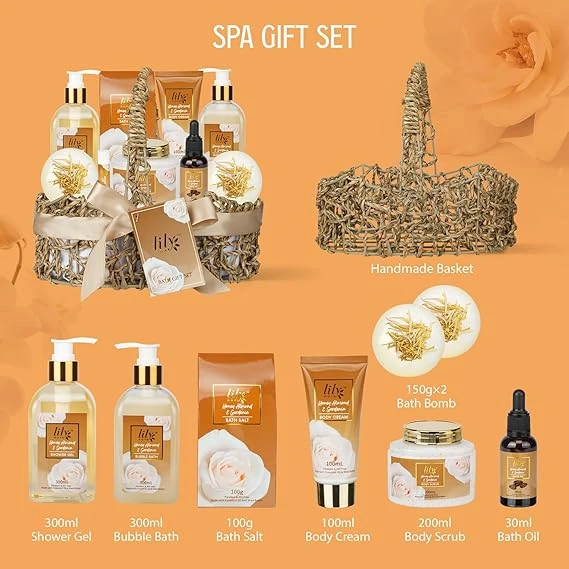Suitable for All Skin TypesThe set is enriched with gentle cleansing and moisturizing formulas, making it suitable for all skin types, including sensitive and dry skin. Indulge in a complete spa-like ritual at home with the Lily Roy Luxury Bath Gift Set. Featuring a rich variety of bath and body products, this beautifully arranged wire basket offers everything needed for relaxation, exfoliation, hydration, and pampering. Perfect as a personal treat or a thoughtful gift, it combines elegance, fragrance, and ultimate self-care. Benefits