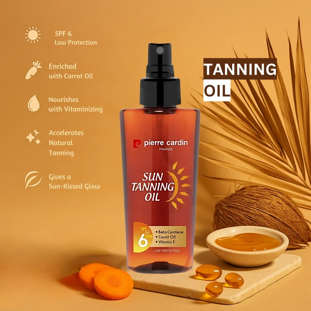 Achieve a natural, golden tan while nourishing your skin with Pierre Cardin Sun Tanning Oil SPF 6. Enriched with Beta-Carotene, Carrot Oil, and Vitamin E, this lightweight oil helps enhance your tan while keeping your skin hydrated and soft under the sun. With low SPF 6 protection, it provides a light shield against UVB rays, ideal for already tanned or darker skin tones. Key Benefits: