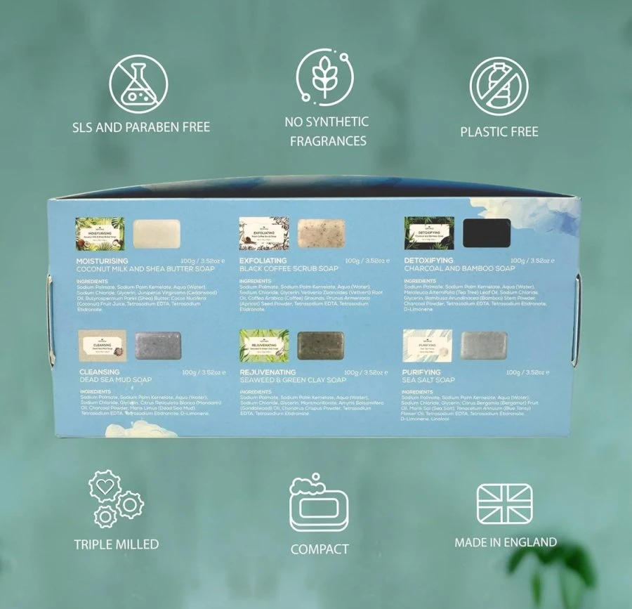 Experience a full spectrum of skincare benefits with the Revital Soap Collection Set. Featuring six premium handcrafted soaps, each bar is designed to target specific skin needs—whether you're cleansing, moisturizing, detoxifying, or exfoliating. Infused with natural ingredients like coconut oil, shea butter, dead sea mud, charcoal, bamboo, and black coffee scrub, this set is your daily escape into nature's healing touch. Beautifully boxed and perfect for personal use or gifting. Key Benefits: