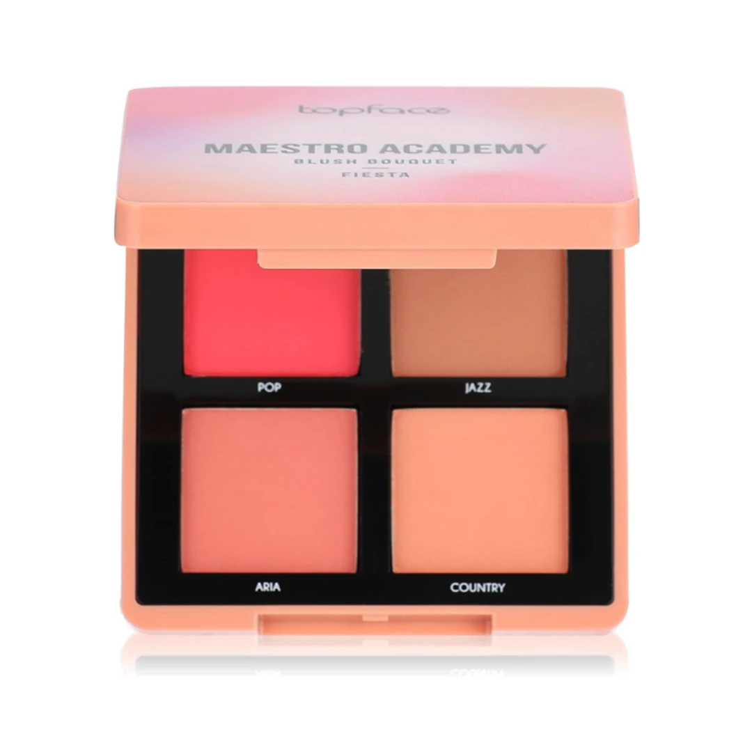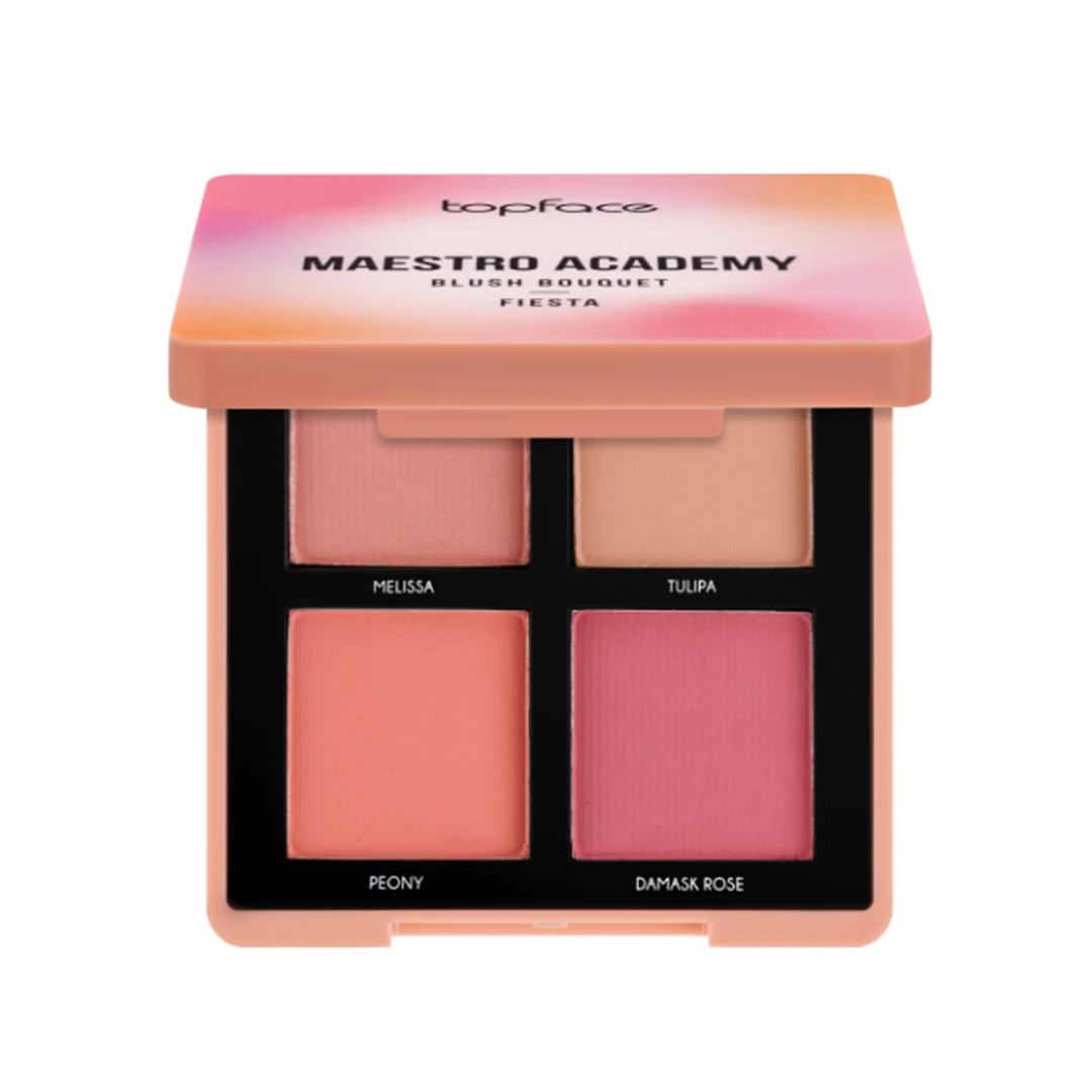 Suitable For: All skin types. including dry, oily, combination, and sensitive skin. Powered by natural squalane, its lightweight texture nourishes and moisturizes without clogging pores or emphasizing dry patches. Elevate your complexion with the Topface Maestro Academy Blush Bouquet, a premium blush palette featuring four delicate shades. Developed to meet professional makeup standards, the pigments effortlessly blend together to create bespoke tints, delivering an instant radiant finish with minimal effort Key Benefits: Infused with natural squalane, which supports lipid synthesis, strengthens facial microbiome, and deeply hydrates the skin Ultra‑lightweight and breathable texture ensures smooth application without clogging pores or emphasizing imperfections. Seamless blendability: Use shades individually or mix them to create custom tones that harmonize beautifully Camouflaging effect: Applies naturally to diffuse redness and even skin tone Long-lasting wear: Users report 8–10 hours of color retention, especially for shades like “Pop” and “Country.” Gentle fading occurs thereafter. Application Area: Cheeks: Ideal for apples and cheekbones. swirl for a soft flush. How to Use: Smile to locate the apples of your cheeks. Swirl a fluffy brush across one or all shades. tap off excess. Lightly press onto cheeks and blend upward toward temples for a diffuse finish. Mix shades for custom tones, or layer shades for deeper impact. Use remaining pigment for light eyeshadow if desired. Usage Warnings: For external use only. Avoid contact with eyes. Discontinue use if irritation, redness, or rash occurs. Patch-test recommended for sensitive skin. Close the compact securely after use. Store in a cool, dry location away from direct sunlight and heat. |