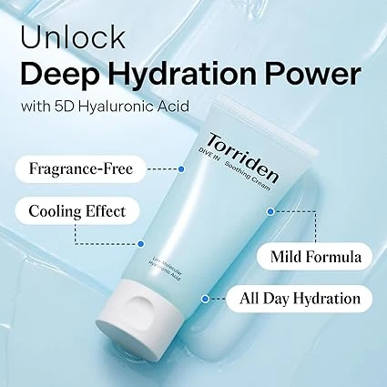 Suitable ForThis cream is suitable for all skin types, including sensitive and dehydrated skin. Its lightweight texture makes it especially good for oily/combination skin that still needs hydration without heaviness. Discover deep hydration with Torriden DIVE-IN Soothing Cream. Powered by low molecular weight hyaluronic acid, this award-winning moisturizer penetrates deep into the skin, replenishing moisture and soothing irritation. Its refreshing gel-cream texture absorbs quickly, leaving your skin calm, plump, and radiant all day long. Key Benefits