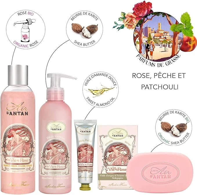 Suitable for:All skin types – including normal, dry, sensitive, and mature skin. Celebrate timeless beauty and tender care with the Un Air d’Antan "La Vie en Rose" Gift Set – an elegant, vintage-inspired collection designed to pamper, nourish, and uplift. Infused with delicate rose and peony notes, shea butter, and natural oils, this luxurious French skincare set brings together gentle cleansing, rich hydration, and soothing comfort, all wrapped in nostalgic Art Nouveau packaging. A perfect tribute for mothers or loved ones. Benefits:Shower Cream (La Vie en Rose):