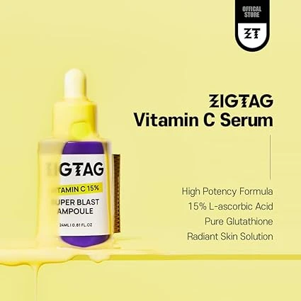 Suitable for all skin typesThis ampoule is suitable for most skin types, including normal, oily, and combination skin. It is particularly effective for dull, uneven, or pigmented skin. Sensitive skin should patch-test first, as the high concentration of Vitamin C (15%) may cause irritation. Power up your glow with the Zigzag Vitamin C 15% Super Blast Ampoule! Packed with a potent dose of pure Vitamin C, this ampoule is designed to target dark spots, dullness, and uneven skin tone. Its lightweight, fast-absorbing formula brightens the skin, boosts radiance, and helps restore a youthful glow. Perfect for anyone looking to supercharge their skincare routine with an intensive brightening treatment. Benefits